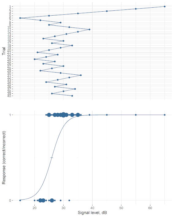 Material/Methode: Das neue Wortmaterial umfasst 60 Zweisilber und 40 Einsilber in den Dialekten Baseldeutsch, Berndeutsch, Zürichdeutsch, Walliserdeutsch sowie in Hochdeutsch sowie die passenden Bilder. Abbildung 1 [Abb. 1] zeigt sechs Beispiele, welche dem Kind als Auswahl für die Antwort angeboten werden. Mit dem dazugehörigen Picture-pointing-Test und einer adaptiven Pegelsteuerung lässt sich die Sprachverständlichkeit in Ruhe und im Störschall bestimmen. Abbildung 2 [Abb. 2] zeigt ein Beispiel der adaptiven Testprozedur sowie die Antworten und die daraus abgeleitete psychometrische Funktion der Sprachverständlichkeit.