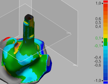 Methoden: Es wurden zwei künstliche Gehörgänge (ein geradliniger eckiger und ein anatomisch geschwungener) im CAD konstruiert und mittels 3D-Druck gefertigt. Diese dienen als Referenz für die Analyse der Abweichung zwischen digitaler und herkömmlicher Abformung. Fünf Personen führten jeweils drei konventionelle Abformungen mit den Abformmassen zweier Hersteller sowie drei digitale Abformungen mit einem Handscanner durch. Die resultierenden 3D-Modelle wurden durch Best-Fit-Überlagerung in dem Programm Geomagic Design X mit dem CAD-Referenzmodell verglichen. Bewertet wurden die durchschnittliche Abweichung, welche Hinweise auf eine Schrumpfung gibt, sowie der RMS-Wert (Root Mean Square) als richtungsunabhängiges Abweichungsmaß.