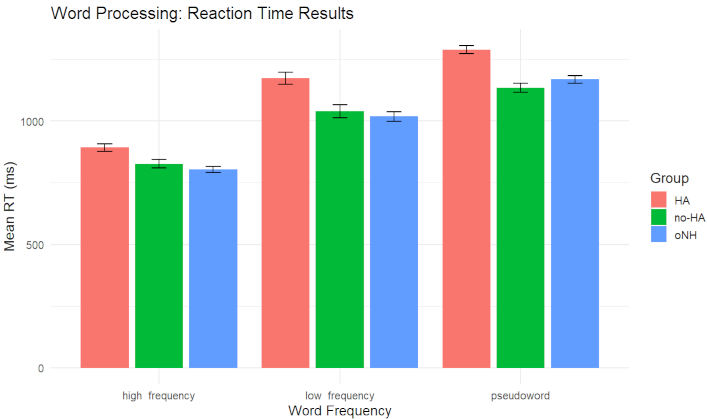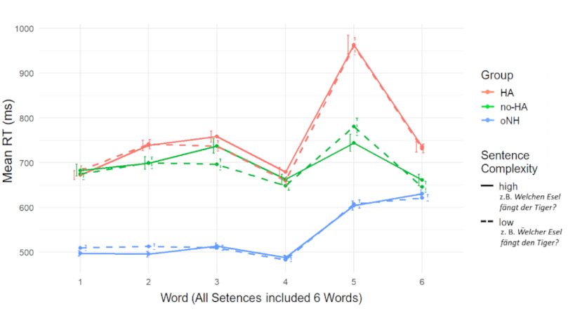 Methods: Participants were older German-speaking adults: 39 with normal hearing (NH; mean age 61.2) and 48 with HL, namely 34 using hearing aids (HA; 69.7), and 14 without hearing aids (no-HA; 68.9). They were tested on two reading tasks: (1) word processing via a lexical decision task with 40 high/low frequency words and 40 pseudowords, (2) sentence processing via a word-for-word reading task involving more and less complex sentences combined with picture selection to test reading comprehension. Additional measures include: a verbal and numerical working memory task, pure tone averages (PTA), and duration of hearing aid use in HA.