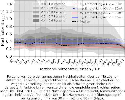 Ergebnisse: Die gemessenen Nachhallzeiten in Abbildung 1 [Abb. 1] zeigen eine hohe Varianz über die betrachteten Räume. Obwohl keine Empfehlungen für logopädisch genutzte Therapieräume existieren, erfüllen nur wenige Räume die Anforderungen der Nutzungsart „Unterricht/Kommunikation inklusiv“ der DIN 18041:2016-03. Weiter zeigt sich, dass die betrachteten Stimmqualitätmaße zum Teil deutlich durch die Raumakustik beeinflusst werden. Bereits mittlere Nachhallzeiten führen zu erheblichen Verschiebungen der objektiven Parameter. Besonders betroffen sind physiologische und leicht pathologische Stimmen, die durch Raumakustik fälschlich „pathologischer“ erscheinen können und somit die Fasch-Positiv Rate erhöhen. Lavaliermikrofone reduzieren die Effekte, verhindern sie aber nicht vollständig. Klarheitsmaße erweisen sich als robuste Prädiktoren für die Richtung und Stärke der Verzerrung.