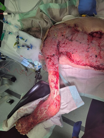Abbildung 1: Pat. mit schwerstem NSTI durch Strep. Pyogenes der oberen Extremität und thorakal nach teilweiser Defektdeckung mittels autologer Spalthauttransplantation