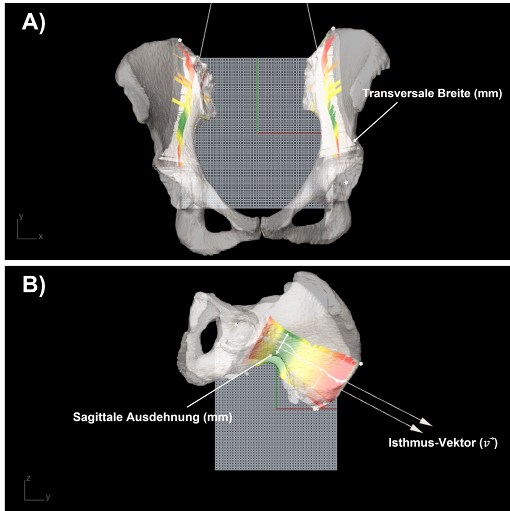 Material und Methoden: Hochauflösende CT-Bildgebung von 51 Becken (28 männliche Becken (MB), 23 weibliche Becken (WB)) wurde mit Materialise Mimics® schwellenwertbasiert segmentiert. Die segmentierten Daten wurden in 3D-Mesh-Dateien umgewandelt und in Rhinoceros 3D 8 importiert.Der iliakale Isthmus wurde durch folgende anatomische Landmarken definiert: Spina iliaca posterior superior, höchster Punkt der Crista iliaca, Mitte des Iliosakralgelenks (ISG) und das azetabuläre Rotationszentrum (ARZ). Ein von uns entwickelter Grasshopper-Algorithmus teilautomatisierte die morphometrische Analyse. Der Isthmus-Verlauf wurde durch das arithmetische Mittel der ersten drei Punkte bestimmt, das ARZ diente als Ursprung. Ein zylindrischer Hohlraum entlang einer Bézier-Kurve wurde modelliert und subtrahiert. Anschließend wurden Vektorkoordinaten, Isthmuslänge, Volumen, minimale/maximale Breiten (Transversal-/Sagittalebene) sowie der Umfang in 0,5-mm-Intervallen mit GraphPad analysiert.