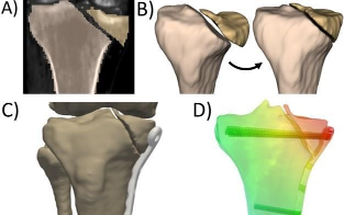 Abbildung 1: Darstellung der REPAIR-Subalgorithmen anhand einer artifiziell erstellten Fraktur A) CT Bildsegmentierung der NIFTI-Datei B) Virtuelle Frakturreposition am 3D-CT C) Ansicht der Implantatempfehlung und virtuelle Platzierung als STL-Modell D) FE-Analyse der empfohlenen Osteosynthese mit Farbkodierung der Verschiebung unter Last mittels Ampelsystem