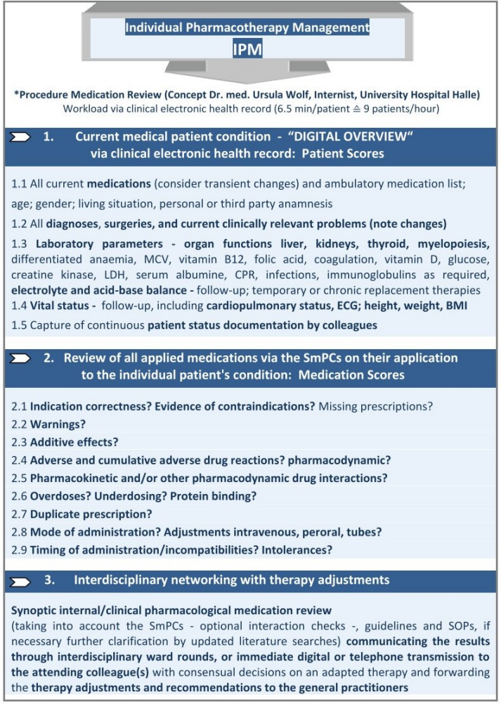 * IPM (applied Patient and Medication Scores) based on the inpatient Electronic Health Record (EHR) and Summaries of Product Characteristics (SmPCs), defined, conceptualised, implemented and practised by Ursula Wolf, MD, Head of Pharmacotherapy Management Department, Specialist in Internal Medicine with expertise in Clinical Pharmacology, performed >65,800 individual medication reviews for polypharmacy in elderly trauma, dementia, transplant and intensive care patients. The IPM physician applies the SmPCs by matching their evidence-based defined risks to the digitally captured individual Patient Scores which provide the necessary ‘comprehensive patient overview’.