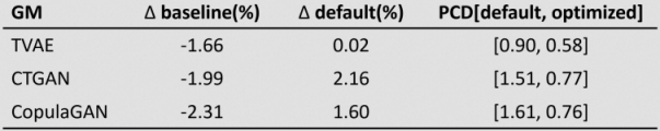 Results: Table 1 [Tab. 1] presents intermediate results that illustrate the general trend observed. The hyperparameters of the GMs are optimized based on the achieved PCD to guide model selection. The SD generated by the optimized GMs is then used to train classifiers, subsequently evaluated on test RD using AUROC. Classifier performance when trained on RD is reported as the baseline. We report the percentage difference in AUROC relative to the baseline (∆ baseline), to default GM configuration (∆ default), and the PCD of optimized and default GMs (PCD[default, optimized]).