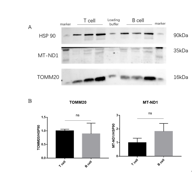 Figure 1: Western blot analysis of mitochondrial proteins in T and B cells from male RA patients and healthy male controls. (A) WB bands showing the expression of TOMM20 and MT-ND1 in isolated T and B cells. HSP90 was served as a loading control. (B) Quantification of protein expression levels relative to HSP90. No significant difference was observed in TOMM20 expression between T and B cells. Data are presented as mean ± standard deviation (SD). Analysis was performed using Student t-test (p < 0.05 was considered significant).