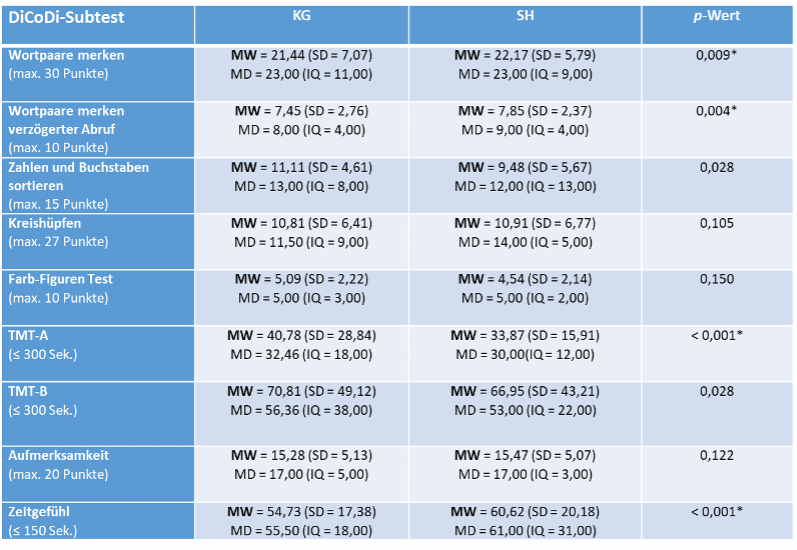 Methoden: Es wurden insgesamt 377 Personen untersucht, davon 204 Proband*innen in der Kontrollgruppe (KG; Frauen n = 118 (57,8%), Alter M = 67,67 Jahre (SD = 12,2)) und 173 Proband*innen in der Gruppe aus Personen mit SH (Frauen n = 81 (46,8%), Alter M = 72,86 Jahre (SD = 8,7)). Der DiCoDi dauert 30 Minuten und umfasst sieben Subtests sowie eine kognitiv-affektive Selbstevaluation. Alle Items werden visuell und in ausreichender Größe dargeboten. Es kann ein Summenwert von maximal 40 Punkten erreicht werden. Zusätzlich wurde eine umfassende neuropsychologische Testbatterie durchgeführt. Auch wurde die ReTest-Reliabilität in einer KG (n = 71) im Mittel nach 6 Wochen bestimmt.