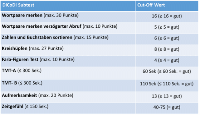 Tabelle 2: Cut-Off-Werte der DiCoDi-Subtests. Anmerkung: Bestimmung der Cut-Off-Werte basierend auf der deskriptiven Statistik der KG anhand MW und SD und nach Augenscheinvalidität