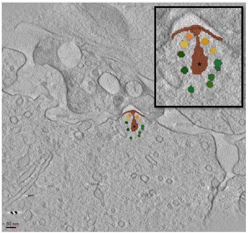 Abbildung 1: Screenshot eines in Napari geöffneten Tomogramms einer Band-Synapse in 2D-Ansicht. Zu sehen sind die automatisch generierten Annotationen für Band (*), präsynaptische Dichte, Membran (braun) und für die Vesikel-Pools (grün: band-assoziiert. Orange: membrannah).