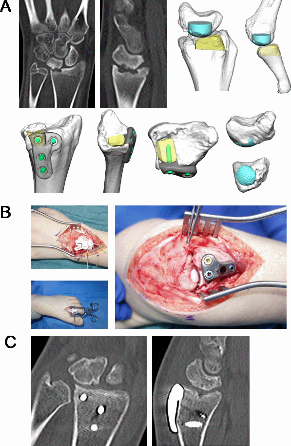 Fallbeschreibung: Ein 12-jähriges Mädchen stellte sich mit einer schmerzhaften Bewegungseinschränkung des linken Handgelenks vor, vier Jahre nach einer konservativ behandelten distalen Radiusfraktur. Bildgebend zeigte sich eine isolierte Zerstörung der radiolunären Artikulation mit einem großen osteochondralen Defekt. Aufgrund der Ablehnung einer Teilfusion wurde für eine biologische Rekonstruktion mittels autologer osteochondraler Transplantation entschieden. Die komplexe Rekonstruktion wurde mit CT-basierter 3D-Planung und patientenspezifischen Implantaten durchgeführt.