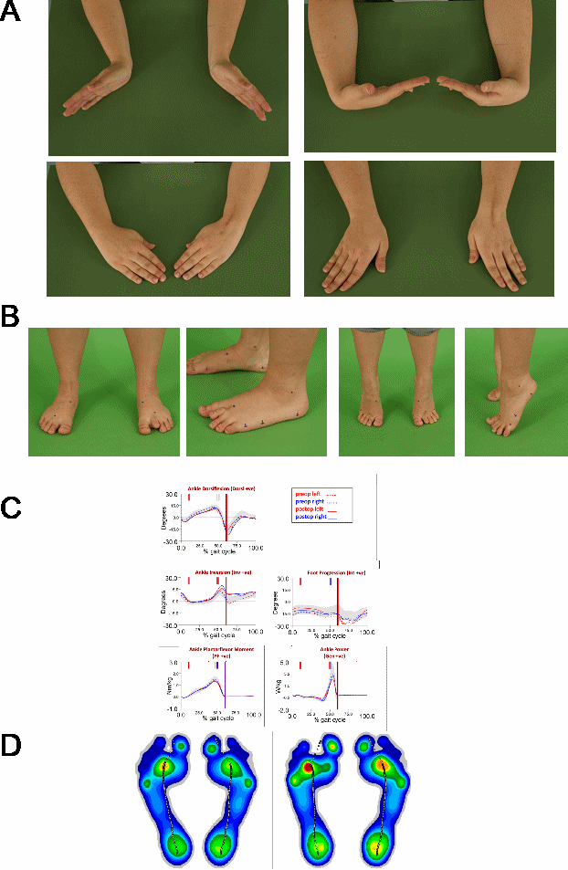 Abbildung 2: A: Funktionsaufnahmen ein Jahr postoperativ, B: Funktionsaufnahmen beider Füße, C: Ganganalyse Prä- und ein Jahr postoperativ: ein harmonisches Muster beidseits ohne Einschränkung des Gangbildes, D:Pedobarography beider Füße beim Laufen (links: präoperativ, rechts: ein Jahr postoperativ).