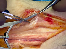 Abbildung 1: Weißliche Auflagerung im Perineurium des N. medianus