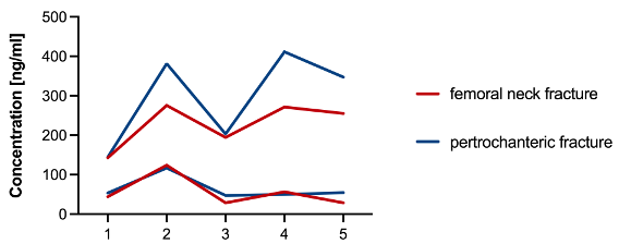 Diskussion und Schlussfolgerung: Diese ersten Ergebnisse zeigen einen möglicherweise systematischen Unterschied in den Konzentrationskurven von cfDNA (90 bp) zwischen Patienten mit Oberschenkelhalsfraktur mit endoprothetischer Versorgung und Patienten mit pertrochantärer Fraktur und osteosynthetischer Behandlung.