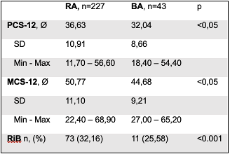 Ergebnisse: Die Auswertung der Lebensqualität zeigte signifikant (p<0,05) höhere PCS-12-Werte (RA: 36,63; BA: 32,04) sowie MCS-12-Werte (RA: 50,77; BA: 44,68) für Patienten nach RA im Vergleich zur BA-Kohorte. 17,2% der RA-Patienten und 21,7% der BA-Patienten gaben an, weiter im erlernten Beruf tätig zu sein. Nach Ausschluss der Patienten, die bereits vor der Operation in Altersrente waren, verblieben32 % der RA-Patienten im Vergleich zu 25% der BA-Patienten in ihren erlernten Beruf (p<0.001).