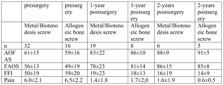 Results: Complete union was recorded after 3.6 months and 4.5 months for the human allogeneic cortical bone screw (Figure 1 [Abb. 1]) and Metal/Biotenodesis group, respectively. PROM’s of 27 patients after 1-year and 11 patients after 2-years are shown in the Table 1 [Tab. 1]. For both groups, the PROM’s improved. Table 1 [Tab. 1] shows that the allogeneic bone screw group tend to achieve better results earlier, for all PROM’s. A total of 11 implant removals (33%) were performed in the Metal/Biotenodesis group.