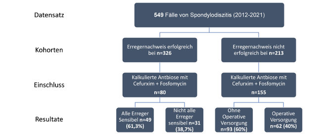 Untersucht wurde die Wirksamkeit einer kalkulierten antibiotischen Therapie mit Cefuroxim und Fosfomycin (hausinterner Standard), aufgeteilt in zwei Kohorten: Bei erfolgtem Erregernachweis (K1, n= 326) wurden die Resistogramme auf die Sensibilität der o.g. Antibiose untersucht und als erfolgreich gewertet, wenn alle Erreger sensibel für die o.g. Antibiose waren. Bei frustranem Erregernachweis (K2, n= 213) wurde die Therapie als erfolgreich gewertet, wenn es unter o.g. antibiotischer Behandlung kein wesentliches Fortschreiten des klinischen und radiologischen Befundes gab oder die Notwendigkeit zur operativen Therapie.
