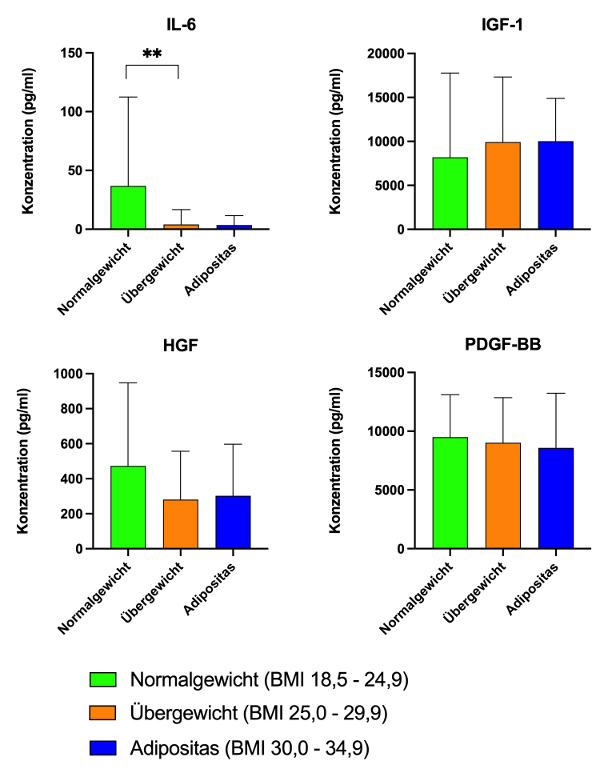 Ergebnisse: Leukozyten und Erythrozyten im PRP waren depletiert. Die statistische Analyse ergab keinen Einfluss des BMI auf die Konzentration von Thrombozyten (509,29±122,651), der Thrombozyten PRP/Vollblut Ratio (2,09±0,35) oder auf die Konzentrationen von HGF, PDGF-BB und IGF-1 im PRP. IL-6 zeigte jedoch eine signifikant negative Korrelation mit dem BMI(r =-0.372, p<0.001). Die IL-6-Konzentration war bei normalgewichtigen Probanden signifikant höher als bei übergewichtigen (p=0.002), siehe Abbildung 1 [Abb. 1].