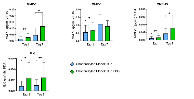 Ergebnisse: In den BG-behandelten-Chondrozyten-Monokulturen waren im Vergleich zu den unbehandelten Chondrozyten-Monokulturen an Tag 1 und 7 die Genexpression von MMP-1, IL-6 und TLR-4 signifikant erhöht und von Aggrecan und Kollagen II signifikant reduziert. Zudem war an Tag 1 die Genexpression von Kollagen X, MMP-9/-13, IL-1β und TNF-α in der BG-behandelten-Kultur signifikant erhöht. In den Kulturüberständen wurden im Vergleich zur Chondrozyten Monokultur in der BG-behandelten-Kultur an Tag 1 und 7 signifikant höhere Proteinkonzentrationen von MMP-1/-13 sowie IL-6 und an Tag 1 eine signifikant höhere MMP-3-Konzentration bestimmt (siehe Abbildung 1 [Abb. 1]).