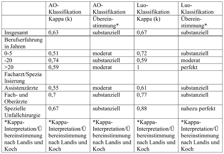 Diskussion und Schlussfolgerung: Die in dieser Studie geprüften Parameter ergaben keine signifikanten Unterschiede zwischen der AO- und Luo-Klassifikation. Um die Validität der Ergebnisse zu erhöhen, wären sowohl ein größeres Teilnehmer*innenfeld als auch eine größere Fallzahl sinnvoll.