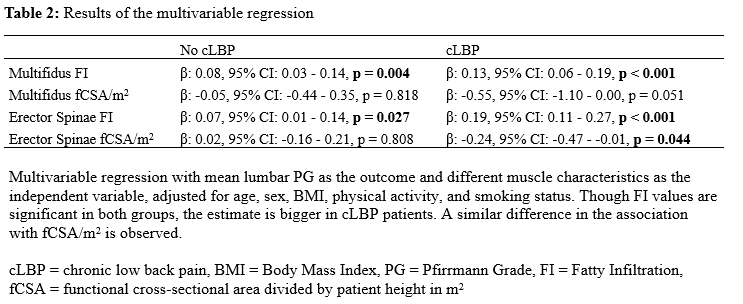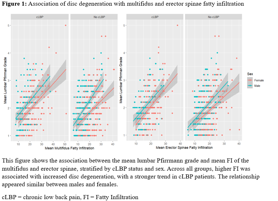 Material and methods: Participants aged 18 to 64 with and without chronic low back pain (cLBP) were prospectively enrolled from the general population. Paraspinal muscle atrophy was assessed on T2-weighted axial MRI by measuring fat infiltration (FI) and functional cross-sectional area (fCSA) of the multifidus (MF) and erector spinae (ES) at each lumbar level. FI and fCSA values were averaged across all lumbar levels to reflect overall muscle condition. Lumbar disc degeneration was classified according to the Pfirrmann Classification at each level, and a mean lumbar value was calculated. The association between muscle and disc degeneration was analyzed in participants with and without cLBP using multivariable linear regression models, adjusted for age, sex, Body Mass Index (BMI), physical activity, measured by the International Physical Activity Questionnaire (IPAQ), and smoking.