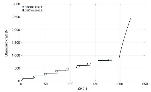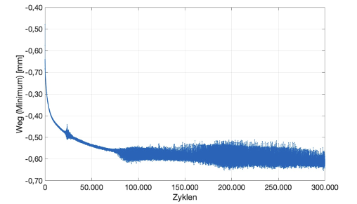 Ergebnisse: Die Ergebnisse zeigen, dass der Smart-Spacer mechanisch stabil und funktional zuverlässig ist. Unter statischen Belastungen bis 900 N (Abbildung 2 [Abb. 2]) und dynamischen Belastungen von 400 N über 300.000 Zyklen (Abbildung 3 [Abb. 3]) traten weder Materialversagen noch Rissbildung auf. Die Funktionalität der integrierten Sensorik blieb während der gesamten Tests uneingeschränkt. Die kontinuierliche Datenübertragung funktionierte fehlerfrei und die Messergebnisse blieben stabil. Tests mit erhöhten Belastungen zeigten, dass Materialversagen erst bei Kräften über 1.700 N auftrat, womit die Belastungsgrenze des Smart-Spacers definiert wurde. Die FEM-Simulationen bestätigten die mechanische Robustheit, identifizierten jedoch das Kamera-Fenster als kritischen Schwachpunkt, der für zukünftige Designoptimierungen berücksichtigt werden sollte.