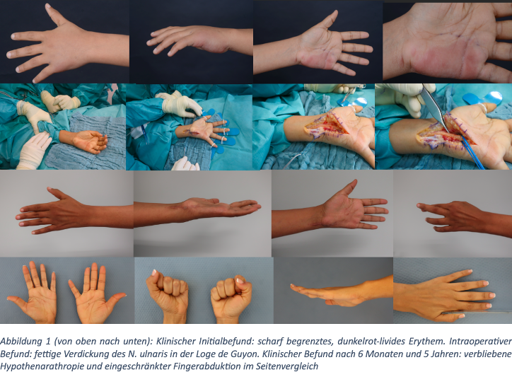 Die Indikation zur Spaltung der Guyon-Loge und Neurolyse wurde gestellt. Biopsien vom Haut- und Nervengewebe sowie der Hypothenarmuskulatur wurden aufgearbeitet. Histologisch zeigte sich eine chronische granulomatöse Entzündung mit Nachweis von säurefesten Stäbchen in der Ziehl-Neelsen-Färbung. Der Verdacht der tuberkuloiden Lepra konnte durch eine positive M. leprea Serologie (IgM) und dem Nachweis einer positiven PCR im Referenzlabor (Bernhard Nocht Institut) bestätigt werden. Gemeinsam mit Beschluss im Infektiologieboard wurde eine dreifach Antibiose mit Dapson, Rifampicin und Flucloxacillin für ein Jahr eingeleitet. Bei neuropathischen Schmerzen wurde die Medikation um Pregabalin erweitert. In der Nervenleitgeschwindigkeit präsentierte sich eine deutliche Verlangsamung des N. ulnaris (22 m/s). Bei Läsion des N. ulnaris den Ramus superficialis und profundus betreffend wurde intensive Handtherapie eingeleitet und engmaschige Kontrollen durchgeführt. Ein Jahr nach Therapiebeginn präsentierte die Patientin eine nahezu freie Funktion der Hand mit leicht reduzierter Sensibilität im Ulnaris Versorgungsgebiet und einer Zwei-Punkt-Diskrimination von 6mm. Die Nervenleitgeschwindigkeit verblieb auch nach 4 Jahren verzögert (20 m/s links, 64m/s rechts) mit einer erhöhten distal motorischen Latenz (4,6 ms links/2,0 ms rechts). Im Nachuntersuchungszeitraum von fünf Jahren ergab es keinen Hinweis auf ein Rezidiv. Der DASH-Score (Disabilities of Arm, Shoulder and Hand) ergab mit 27 Punkten eine moderate verbliebene Einschränkung.