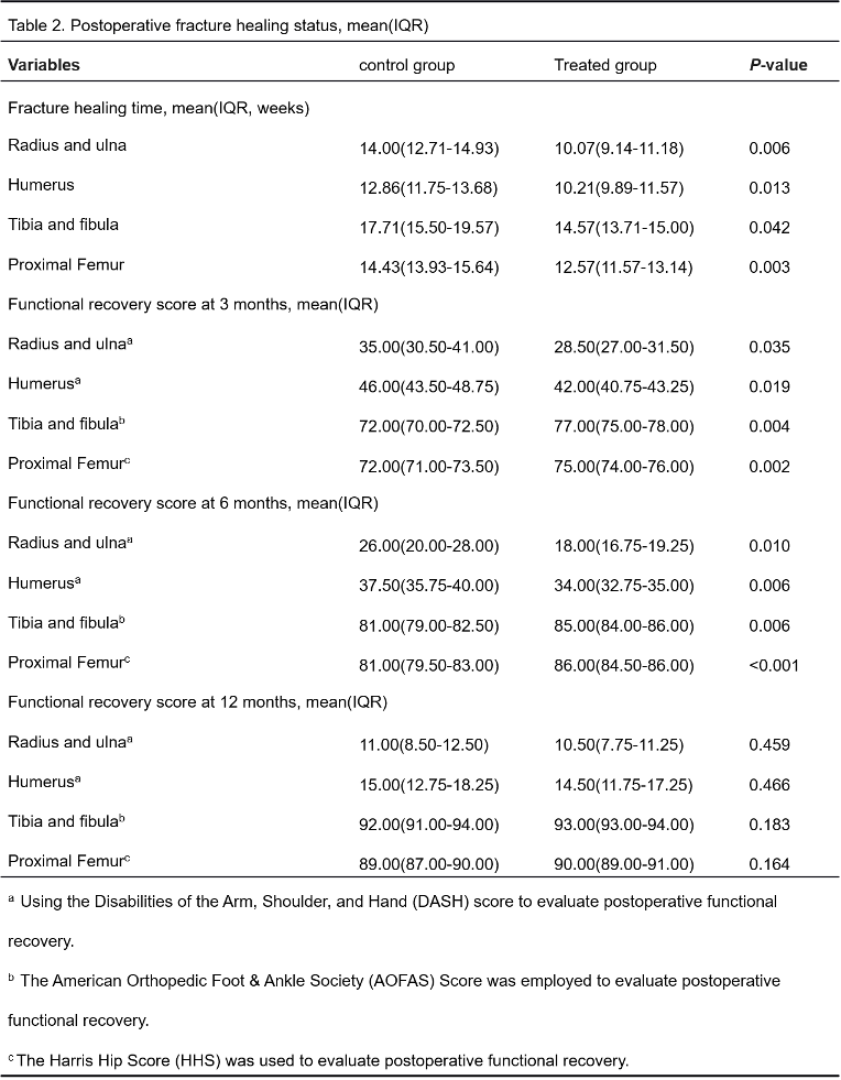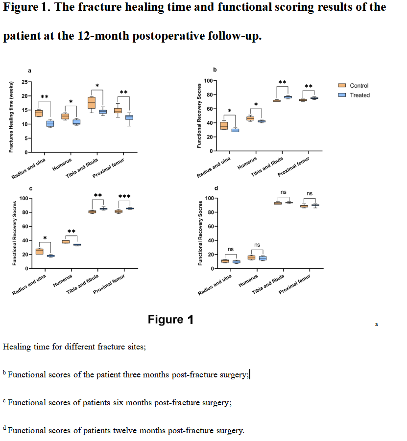 Results: The analysis revealed no significant differences in the baseline characteristics of the two patient groups (P > 0.05), Table 1 [Tab. 1]. At 12 months postoperatively, the experimental group showed significantly shorter median fracture healing times compared to the control group. The median healing times in the experimental group were as follows: radius and ulna, 10.07 weeks (IQR 9.14–11.18); humerus, 10.21 weeks (IQR 9.89–11.57); tibia and fibula, 14.57 weeks (IQR 13.71–15.00); and femur, 12.57 weeks (IQR 11.57–13.14). In contrast, the median healing times in the control group were: radius and ulna, 14.00 weeks (IQR 12.71–14.93); humerus, 12.86 weeks (IQR 11.75–13.68); tibia and fibula, 17.71 weeks (IQR 15.50–19.57); and femur, 14.43 weeks (IQR 13.93–15.64). All differences were statistically significant (P < 0.05). Functional recovery scores at 3 and 6 months were also significantly better in the experimental group across all fracture types (P < 0.05), Table 2 [Tab. 2], Figure 1 [Fig. 1]. During the study period, one case of postoperative incision infection occurred in the experimental group, while there were two cases in the control group. There was no significant difference in the incidence of incision infections between the two groups (P > 0.05). All infected patients achieved successful healing following vacuum-assisted closure (VSD) treatment.
