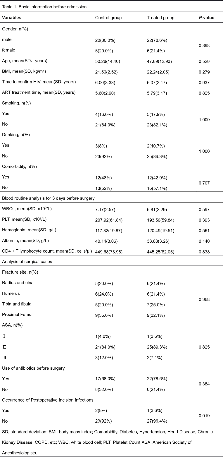 Material and methods: A retrospective cohort study was conducted on HIV-positive patients with fractures who underwent surgical treatment at Zhongnan Hospital of Wuhan University between January 2013 and December 2021. A total of 53 eligible patients were included and divided into two groups: the BMP group (n = 28) and the control group (n = 25). Surgical site infections were managed using the Vacuum Sealing Drainage (VSD) technique.
