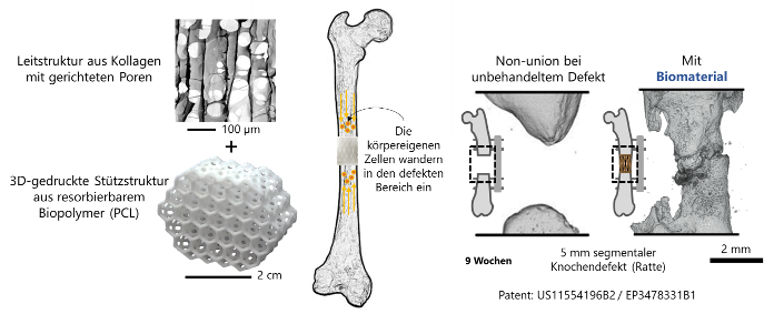 Diskussion und Schlussfolgerung: Durch die Integration einer PCL-Stützstruktur in eine Kollagen-Leitstruktur konnten die Eigenschaften des Biomaterials im Hinblick auf eine Anwendung in großen Knochendefekten deutlich verbessert werden. Aufgrund der aktivierten Rekrutierung von Zellen in das Biomaterial werden vergleichbare Heilungsergebnisse erreicht, wie sie bei bestehenden Biomaterialansätzen nur in Kombination mit autologem Knochen bekannt sind. Im Klein- und Großtiermodell führt die Ausrichtung der extrazellulären Matrixstrukturen zu einem gerichteten Knochenheilungsprozess. Mit dem Ziel der Translation in die Klinik laufen derzeit präklinische Studien im Rahmen des Zulassungsprozesses.