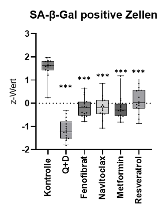 Abbildung 1: Einfluss von Senolytika auf den Anteil SA-ß-Gal-positiver Zellen (N=16, z-standardisiert). Die statistische Analyse erfolgte unter Anwendung eines GEE-Modells mit Sidak-Korrektur. Statistische Signifikanz: *** für p = 0,001, Q+D = Quercetin + Dasatinib.