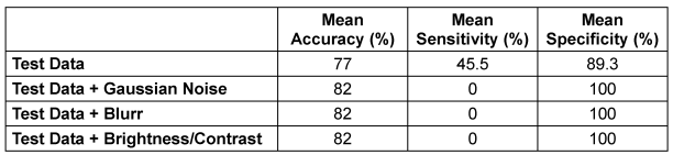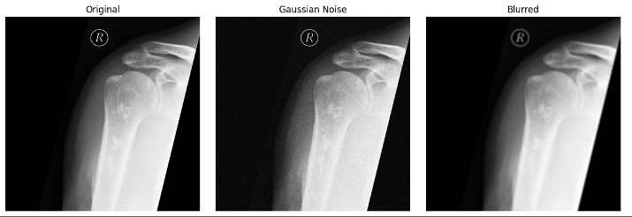 To assess model robustness, we simulated real-world distribution shifts. We introduced three perturbation scenarios to the test set: (1) sensor noise, modeled by adding Gaussian noise; (2) reduced image quality, simulated via image blurring; and (3) variations in acquisition settings, mimicked by modifying brightness and contrast. Model performance was evaluated on test dataset using classification metrics, including accuracy, sensitivity, and specificity. For sensitivity and specificity calculations, we considered Enchondroma as the negative class and ACT as the positive class.