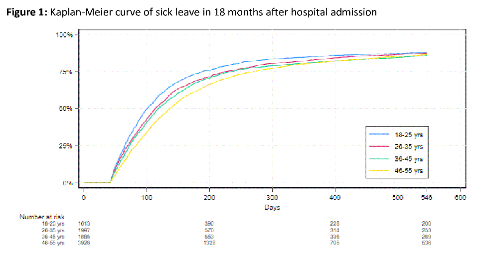 Results: The rate of RTW was 35%, 67%, 82% and 88% after 3/6/12/18 months, respectively (Table 1 [Tab. 1]). Rates differed substantially by age (Figure 1 [Fig. 1]) and injury group being lowest in spinal cord-injured patients and highest in patients with injuries of urinary and other pelvic organs (9%–59% after 3 months). These had the highest/lowest number of sick leave days (275d/98d) and IRRs (1,92/0,68), respectively. Furthermore, in all four multivariable models, ventilation and complications during the index stay as well as pre-existing depression, neurological disease or sick leave were associated with lower RTW rates (Table 2 [Tab. 2]).