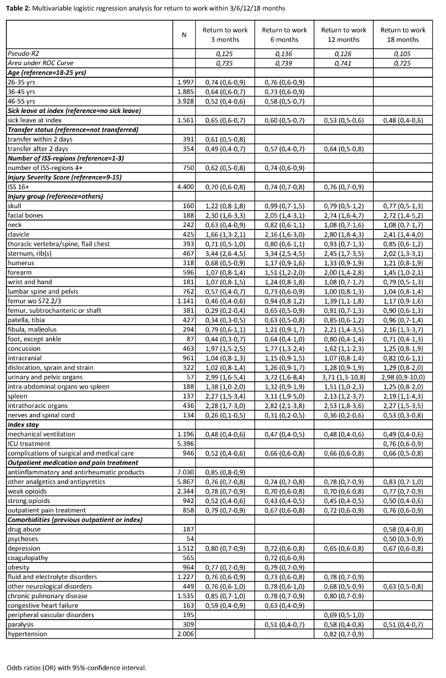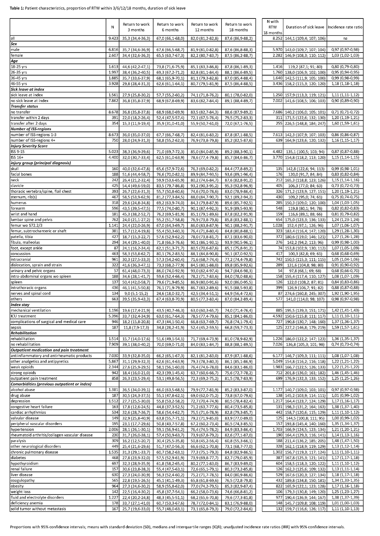 Material and methods: This population-based cohort study uses nationwide health claims data of the AOK, covering 37% of the German population with statutory health insurance. AOK claims data contain de-identified information on patient demographics, working status, hospitalizations, outpatient visits, outpatient drug prescriptions, rehabilitation, and sick leave days. The study included 9,423 AOK-insured employees aged 18 – 55 with a hospital admission for major trauma (ISS≥9) from January 2015 – December 2017 and at least 42 days of sick leave after admission. We examined RTW within 3, 6, 12 and 18 months after admission. RTW was defined as being employed without any sick leave for at least 5 days. In patients with RTW, we determined the duration of sick leave and report unadjusted incidence rate ratios (IRR). Predictors of RTW were assessed using multivariable regression for each time point.