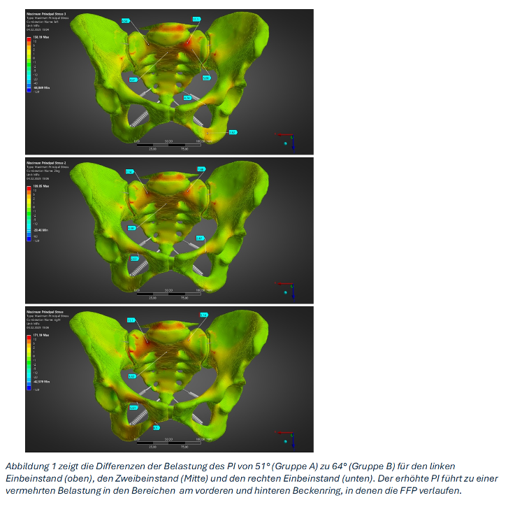 Diskussion und Schlussfolgerung: Die Ergebnisse der vorliegenden Arbeit zeigen, dass ein erhöhter PI zu einer vermehrten Belastung des Beckenrings dort führt, wo das Auftreten von FFP klinisch beobachtet wird. Ein erhöhter PI scheint einen Risikofaktor für das Entstehen dieser Frakturentität darzustellen. Dies deckt sich mit Studienergebnissen aus der Literatur - ein erhöhter PI führt zu einer vermehrten Belastung im lumbosakralen Übergang und korreliert mit dem Schweregrad der Spondylolisthese [8]. Die Bedeutung der spinopelvinen Parameter für die Diagnostik und Therapie bei FFP sind Gegenstand weiterer Studien." /><figcaption>Die Ergebnisse der vorliegenden Arbeit zeigen, dass ein erhöhter PI zu einer vermehrten Belastung des Beckenrings dort führt, wo das Auftreten von FFP klinisch beobachtet wird. Ein erhöhter PI scheint einen Risikofaktor für das Entstehen dieser Frakturentität darzustellen. Dies deckt sich mit Studienergebnissen aus der Literatur - ein erhöhter PI führt zu einer vermehrten Belastung im lumbosakralen Übergang und korreliert mit dem Schweregrad der Spondylolisthese [8]. Die Bedeutung der spinopelvinen Parameter für die Diagnostik und Therapie bei FFP sind Gegenstand weiterer Studien.