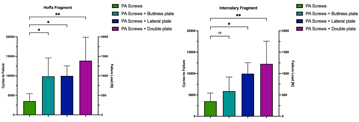 Ergebnisse: Die posteroanteriore Schraubenosteosynthese mit Plattenaugmentation (posterior und/oder lateral) zeigte höhere Zyklenzahlen bis zum Versagen und Versagenslasten (P < 0.05) sowie geringere axiale Verschiebungen des Letenneur Typ IIb Hoffa-Fragments nach 5.000 Zyklen als isoliert posteroanteriore Schrauben (P < 0.05). Beim interkalaren Fragment führten eine zusätzliche laterale Verriegelungs- und eine Doppelplattenfixation im Vergleich zur alleinigen PA-Schraubenfixation zu höheren Zyklenzahlen bis zum Versagen und höheren Versagenslasten (P < 0.05) sowie einer geringeren axialen Verschiebung nach 4.000 Zyklen (P < 0.05), während eine zusätzliche posteriore Abstützplatte die Versagenslast und die interfragmentäre Bewegung in der zentralen Trümmerzone nicht signifikant verbesserte. Alle additiven Plattenkonstrukte führten im Vergleich zur alleinigen PA-Schraubenfixation zu einer geringeren Rotation der Hoffa- und interkalaren Fragmente (P < 0.01).