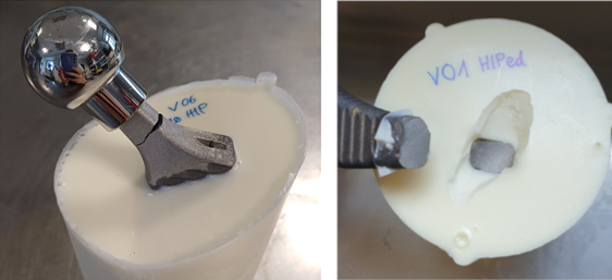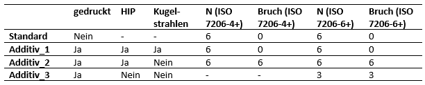 Sämtliche drei Hüftschäfte ohne Nachbehandlungsverfahren (Additiv_3) brachen bei 5,34 KN während der Testung nach ISO 7206-6+, wobei die Zyklenzahl bis zum Bruch geringer war verglichen mit Additiv_2.
