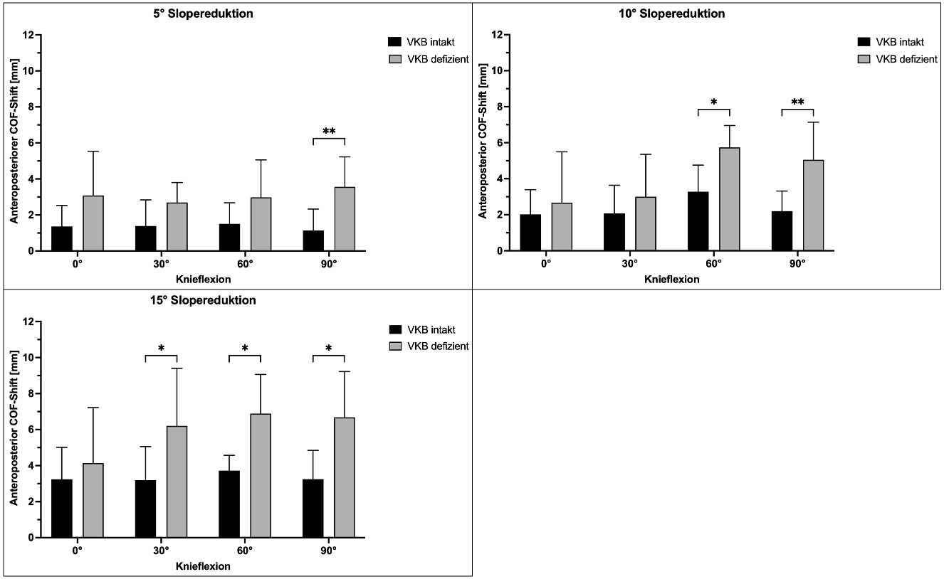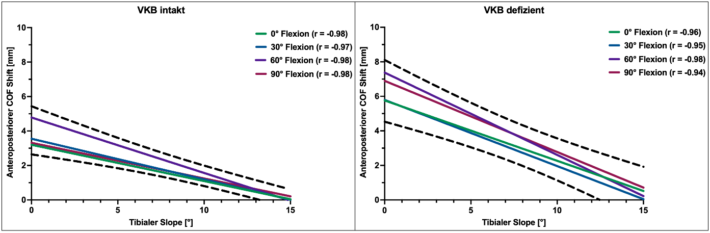 Ergebnisse: Unabhängig vom Flexionswinkel und der VKB-Integrität zeigte der Slope eine starke und lineare Korrelation mit der anteroposterioren COF-Migration (alle Pearson’s r ≤ 0,93; P < 0.01). Eine Slopeverringerung führte bei allen Flexionswinkeln zu einer signifikanten anterioren COF-Translation (P < 0.05), während keine signifikante Medialisierung/Lateralisierung des COF beobachtet wurde. Unabhängig vom Ausmaß der Slopereduktion wurden weder die Kontaktfläche noch der Mittel- und Spitzendruck im lateralen und medialen Kompartiment durch eine infratuberositäre Slopeosteotomie beeinflusst. Im Vergleich zum VKB-intakten Kniegelenk erhöhte eine VKB-Defizienz die anteriore COF-Translation (P < 0.05), während die VKB-Defizienz keinen signifikanten Einfluss auf die mediolaterale COF-Migration, die Kontaktfläche sowie den Mittel- und Spitzendruck hatte.
