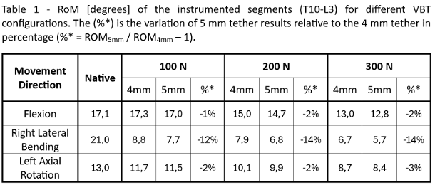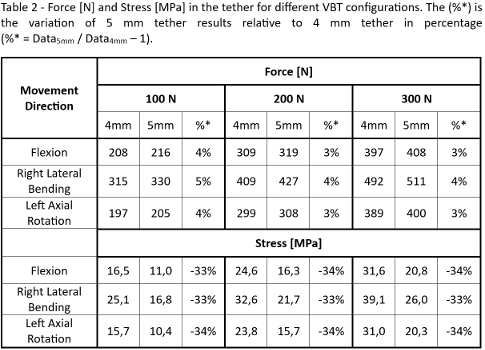 Discussion and conclusions: Increasing the tether diameter from 4mm to 5mm in VBT leads to a substantial reduction in tether stress — by over 30% — despite minor increases in applied force and a slight decrease in RoM. This trade-off suggests that a 5mm tether may offer a safer biomechanical profile by reducing the risk of tether breakage while preserving the spinal mobility close to the traditional tether with a 4 mm diameter. These FE findings support the potential of larger-diameter tethers in optimizing clinical outcomes for scoliosis correction through VBT. Further validation in clinical trials is needed to confirm these biomechanical advantages over the long term.