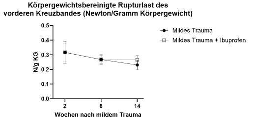 Material und Methoden: Die biomechanische Rupturlast des VKB wurde an 60 C57BL/6-Mäusen in zwei Interventionsgruppen zu drei Zeitpunkten (2, 8 und 14 Wochen post-mildem-Trauma) untersucht. Das MT wurde durch tibiale Kompression des rechten Hinterbeins (75% der alters- und gewichtsangepassten Rupturlast des VKB) in Knieflexion mittels einer biaxialen Belastungsmaschine induziert. Eine Gruppe erhielt zusätzlich eine einwöchige Ibuprofenbehandlung (200 mg/L im Trinkwasser, mit täglicher Messung der Trinkmenge). Verhaltensanalysen zur Allodynie und mechanischen Hyperalgesie wurden über den gesamten Beobachtungszeitraum durchgeführt. Die Rupturlast des isolierten VKB wurde abschließend mit einem Miniatur-Zugprüfgerät in 105° Knieflexion ermittelt.