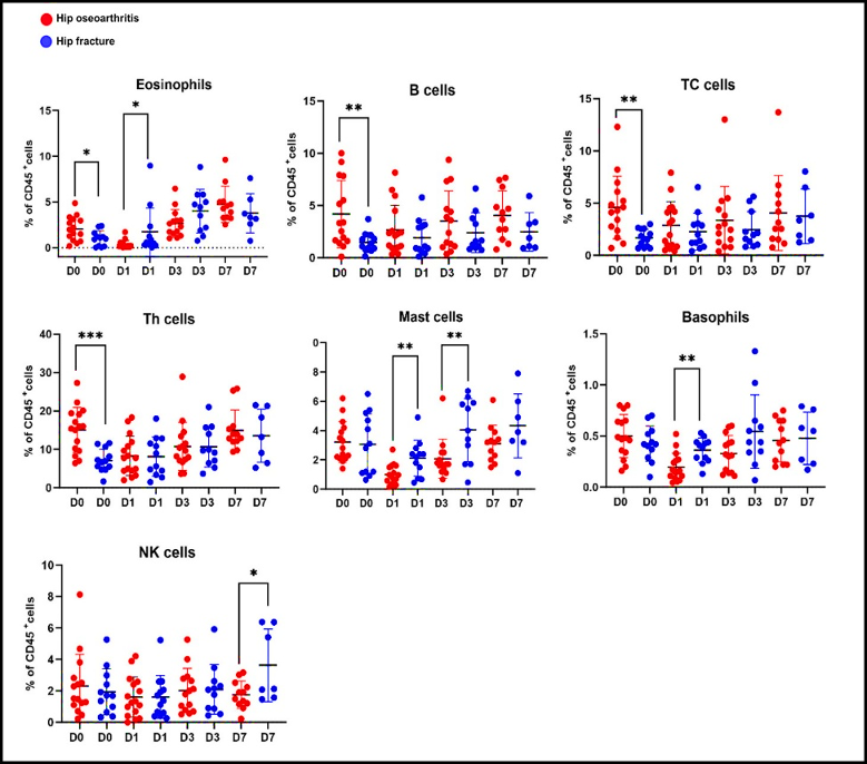 Material and methods: In this prospective study, 30 patients undergoing total hip arthroplasty were enrolled, including 17 with osteoarthritis and 13 with femoral neck fractures. Fracture patients were older (82.1 ± 11.2 vs. 69.1 ± 11.4 years) with higher leukocytes (12.3 ± 7.9 vs. 7.3 ± 2.2 cells/nl) and C-reactive protein levels (30.6 ± 29.5 vs. 2.6 ± 1.59 mg/L), while BMI was similar (24.5 ± 3.3 vs. 26.0 ± 4.1 kg/m²). Peripheral blood samples were collected preoperatively (D0) and on postoperative days 1, 3, and 7. Flow cytometry was employed to assess immune cell populations, including granulocytes (CD19⁺, CD56⁺), monocytes (CD14⁺), various T-helper subsets (Th1, Th2, Th9, Th17, Th22), and regulatory T cells (CD25⁺, CD127⁻). Paired t-tests were used to compare immune cell distributions over time, with statistical significance set at *p < 0.05, **p < 0.01, ***p < 0.001.