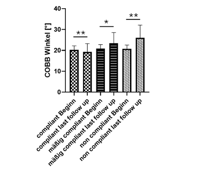 Ergebnisse: Die Behandlung erfolgte über einen Zeitraum von 1,5 bis 3 Jahren. Das Durchschnittsalter der Patient*innen betrug bei Behandlungsbeginn 13,4 (± 1,3) Jahre und nach Beendigung der Therapie, beim last follow up 17,2 (± 1,4) Jahre. Der durchschnittliche Cobb-Winkel lag zu Beginn bei 20,4° (± 2,0°) und blieb bei der letzten Nachuntersuchung bei 20,7° (± 5,1°). Patient*innen mit hoher Compliance zeigten eine signifikante Verbesserung des Cobb-Winkels, während dieser bei mäßiger oder fehlender Compliance zunahm (Abbildung 1 [Fig. 1]).