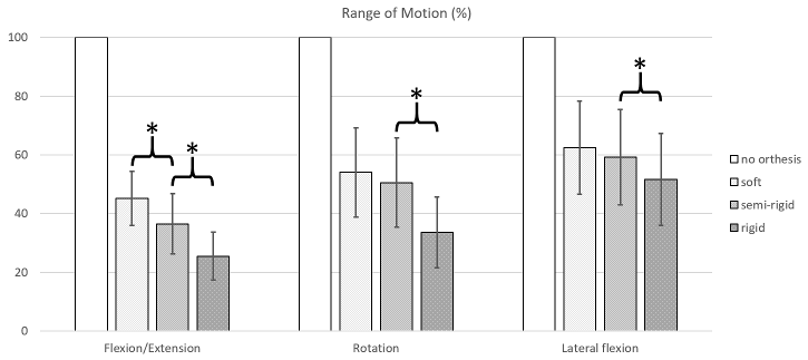 Material und Methoden: Bei 20 gesunden Probanden (6 Frauen, 14 Männer; Alter 21–40 J., Ø: 28 J.) wurde die Beweglichkeit der HWS ohne Halsorthese und nach Anlage drei verschiedener Orthesen gemessen: weich: Cervi-moll, Thuasne; semi-rigide: PDC, Thuasne; rigide: Miami J Select, Ossur. Der Bewegungsumfang wurde durch optisches Tracking von Markern am Kopf und oberen Rücken der Probanden mit Hilfe eines hochauflösenden 3D-Kamerasystem (Aramis 3D Camera, Carl Zeiss GOM Metrology GmbH) quantifiziert. Unterschiede zwischen den Orthesen wurden mittels gepaartem t-Test untersucht.