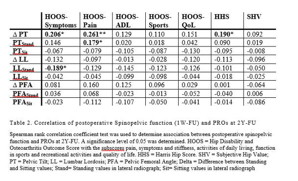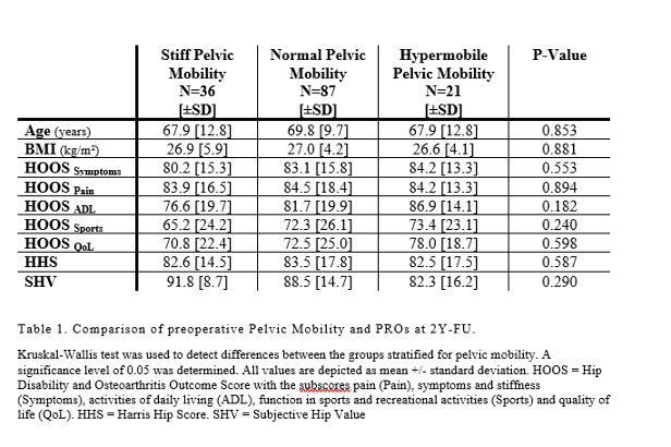 Diskussion und Schlussfolgerung: Diese prospektive Kohortenstudie konnte zeigen, dass eine pathologische präoperative pelvine Mobilität keinen Einfluss auf PROs am 2J-FU hat. Daraus lässt sich schlussfolgern, dass primäre HTEP-Patienten ohne Risikofaktoren (z.B. Wirbelsäulenversteifung, neurologische Erkrankungen: Ausschlusskriterien in unserer Kohorte) unabhängig von ihrer präoperativen pelvinen Mobilität kein inferiores Outcome zu erwarten haben. Dennoch ist basierend auf unseren Ergebnissen davon auszugehen, dass die spinopelvine Funktion und die Position der funktionellen azetabulären Komponenten mit den PROs in Verbindung stehen und die zugrunde liegenden Mechanismen in weiterführenden Studien untersucht werden sollten.