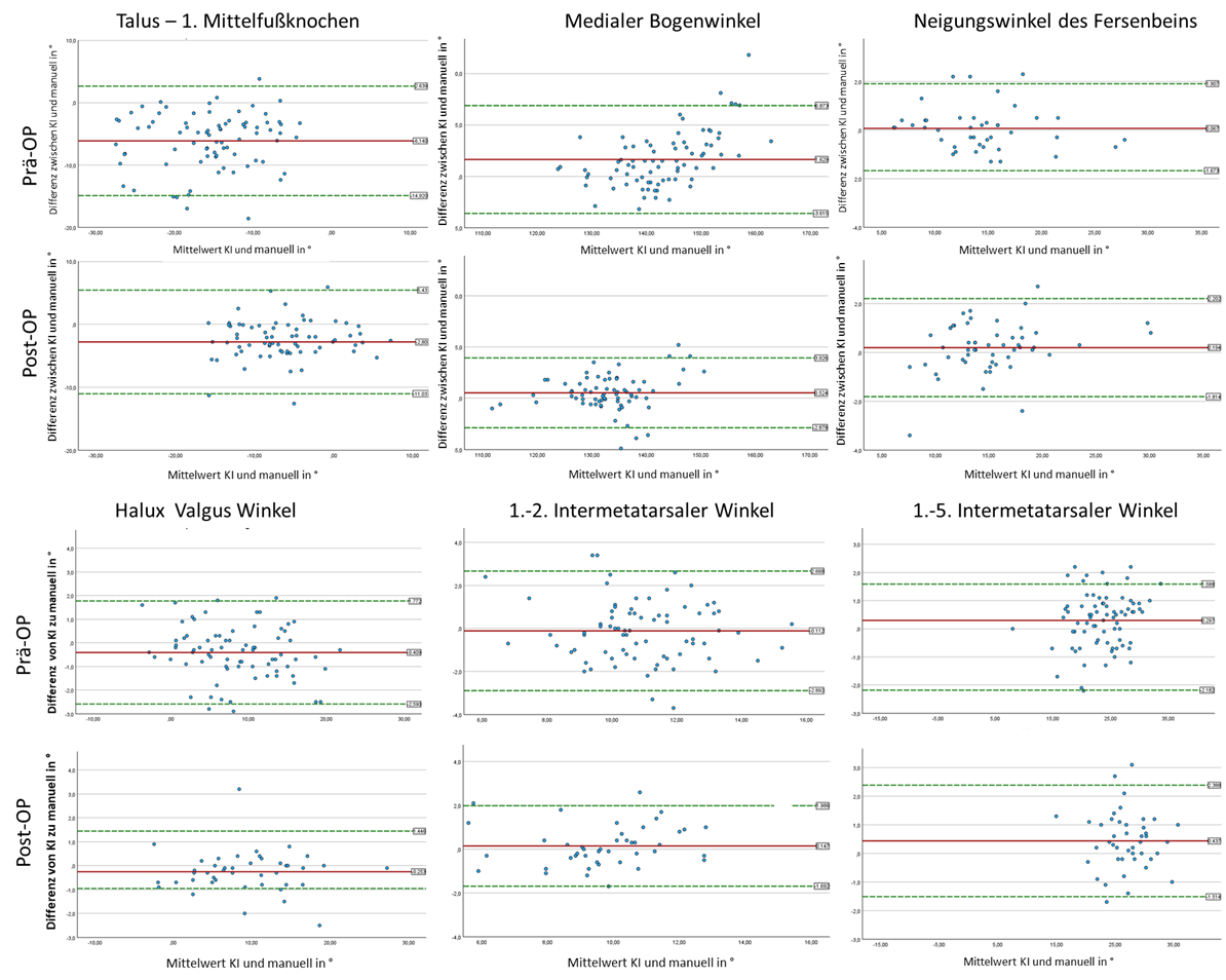 Für den Talus-1.Mittelfußknochenwinkel und den medialen Bogenwinkel wich das Ergebnis der KI prä- und postoperativ statistisch signifikant (p<0,001 und p≤0,013) von der manuellen Messung ab. Der Talus-1.MFK Winkel wurde von der KI größer gemessen mit Abweichung von 6,14°, 95%[-7,14;-5,14] präoperativ und postoperativ 2,80°, 95%[-3,79;-1,81]. Ebenso war der mediale Bogenwinkel präoperativ 1,63°, 95%[1,03;2,23] und postoperativ 0,52°, 95% KI [0,11;0,93]) kleiner mit KI. Der Prozentsatz der präoperativ messbaren Bilder unterlag nicht signifikant dem der postoperativen.