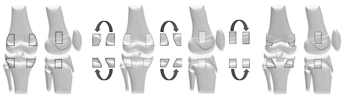 Figure 1: Phemister epiphysiodesis. A rectangular block of cortical bone containing the peripheral physis with adjacent meta-epiphyseal bone is extracted, then reinserted after 180-degree-rotation. Thus, premature epiphysio-diaphyseal fusion is induced. The procedure is executed on the lateral and medial aspect of the distal femur and/or proximal tibia.