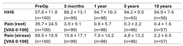 Table 2: HHS and pain development in patients of the Plasmafit study cohort.There were no major radiographic signs indicating loosening of the acetabular cup.