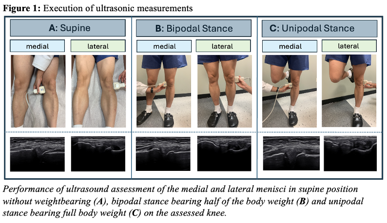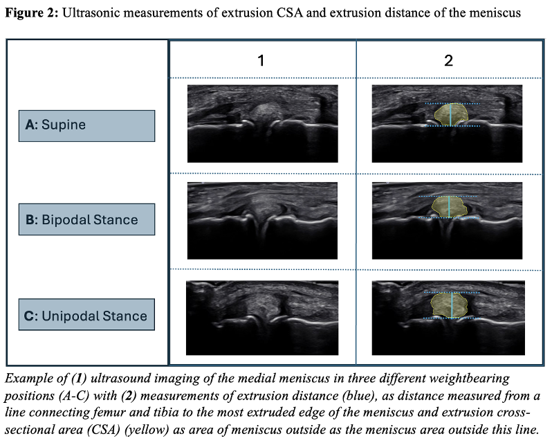 Material and methods: Patients who underwent MAT with minimum 1-year follow-up were included. Exclusion criteria included untreated cartilage injury grade IV at the time of MAT, subsequent MAT resection, and subsequent total knee arthroplasty. All ultrasound measurements were taken in supine position, bipodal, and unipodal stance. Ultrasound was used to measure cross-sectional area (CSA) and distance of extrusion of the meniscus and compared to the equivalent contralateral meniscus to assess side-to-side (STS) differences. Measurements were assessed anterior to the lateral collateral ligament for the lateral meniscus and parallel to the medial collateral ligament for the medial meniscus. Extrusion distance was measured from a line connecting femur and tibia to the most extruded meniscus edge, while extrusion CSA was defined as the meniscus area outside this line. Additionally, bilateral radiographs and PROMs were obtained at the latest follow-up.