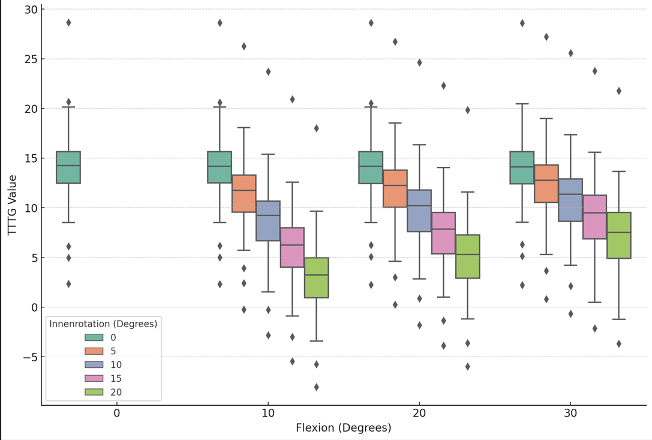 Ergebnisse: Flexion und Innenrotation führten zu signifikanten Veränderungen der TT-TG-Werte (p<0.001). Bei 30° Flexion und 20° Innenrotation lagen die TT-TGWerte bspw. bei 9,75 ± 3,96 mm gegenüber dem gestreckten Bein mit TT-TG Werten von 14,07 ± 3,96 mm. Post-hoc-Analysen zeigten, dass nahezu alle paarweisen Vergleiche zwischen verschiedenen Flexions- und Rotationswinkeln statistisch signifikant waren. Kombinierte Effekte von Flexion und Innenrotation verstärkten Trend synergistisch, wobei hohe Flexions- und Rotationswinkel die stärkste Reduktion der TT-TG-Werte verursachten.