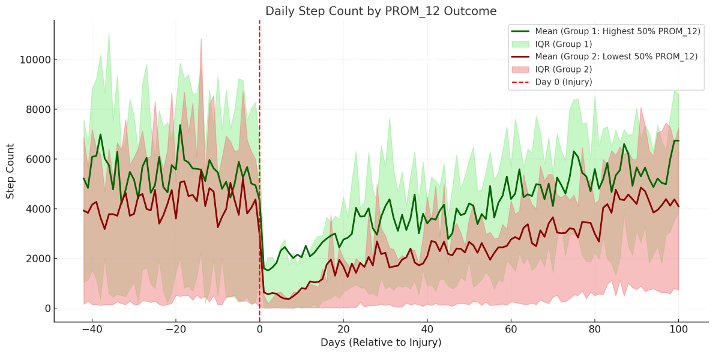 Abbildung 1: Darstellung der aktuellen Ergebnisse bezüglich der Unterscheidungskapazität der täglichen Schrittzahl (y-Achse) über die Zeit vor und nach einem Unfallereignis (x-Achse; Rote vertikale Linie = Unfalltag) zwischen Patienten in der oberen 50 Perzentile für das PROM Outcome nach 3 Monaten (grün) und der unteren 50 Perzentile (rot). Gezeigt ist der Mittelwert (Linie), sowie der Interquartilabstand (transparente Farbe).