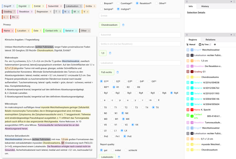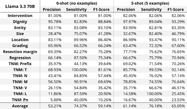 Results: LLMs demonstrated reasonable performance in extracting general medical information, such as tumor dignity and location, with ~90% F1-score (equal balance of sensitivity and precision, see Table 1 [Tab. 1]). However, this is still inadequate for safe and effective use in clinical settings, especially for domain-specific critical parameters such as tumor grading, resection margins, size, and TNM classification with even lower scores. Combining the detailed task description with example-based prompts further improved performance. These findings indicate that despite the success of LLMs in general NLP tasks, their ability to process intricate medical details remains limited without domain-specific adaptation.